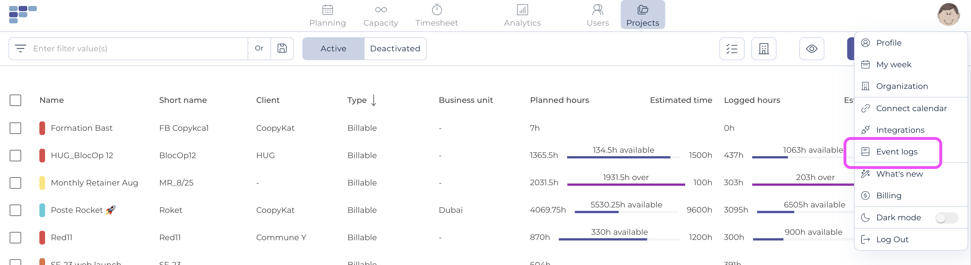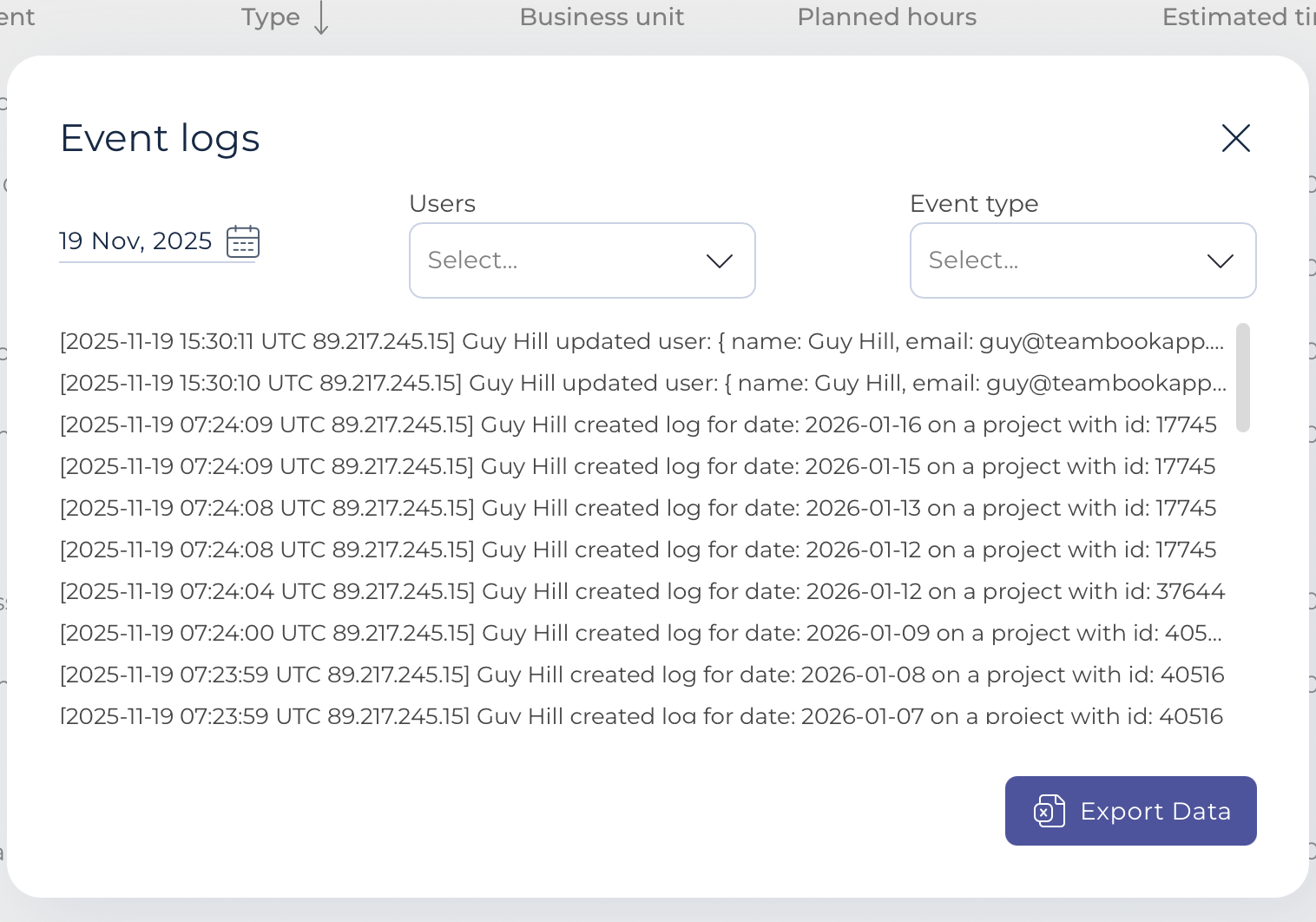 Das Ereignisprotokoll, auch als Audit-Protokoll bennent, zeichnet automatisch alle wichtigen Aktionen in Ihrem Teambook-Konto auf: Erstellungen, Änderungen und Löschungen von Daten (Benutzer, Projekte, Datensätze usw.).