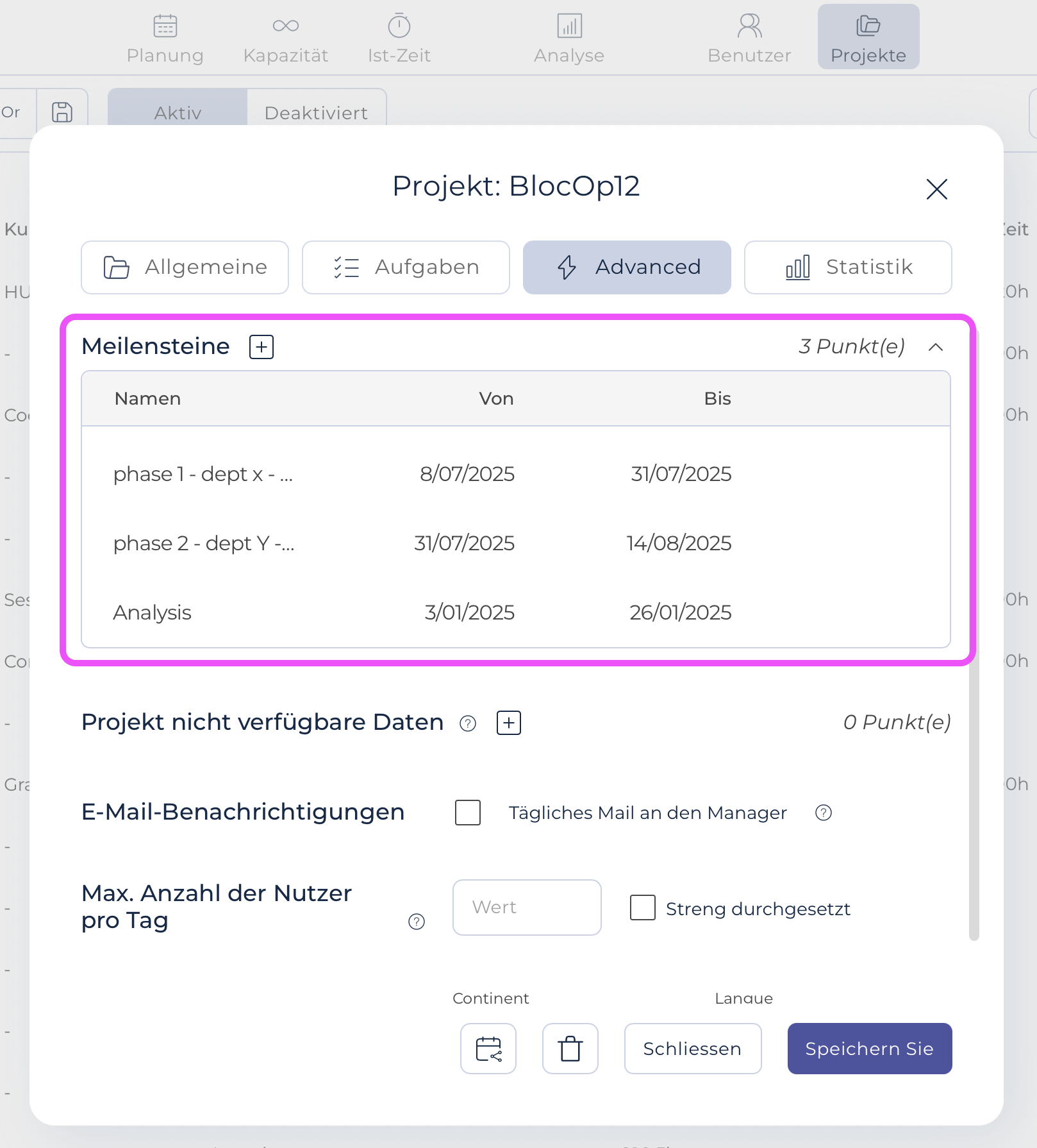 Wählen Sie im Menü „Projekt“ das gewünschte Projekt aus. Auf der Registerkarte „Erweitert“ können Sie Meilensteine anzeigen, hinzufügen und bearbeiten: