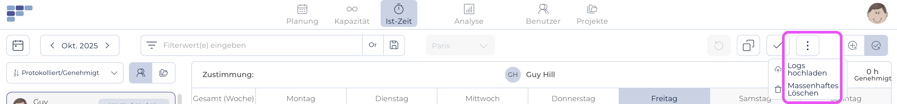 Diese Funktion finden Sie im Modul „Ist-Zeit” auf dem Bildschirm „Freigeben”, wenn Sie auf die Schaltfläche „3 Punkte” klicken. Dort finden Sie auch ein Tool zum Massenlöschen von Zeiterfassungsprotokollen.