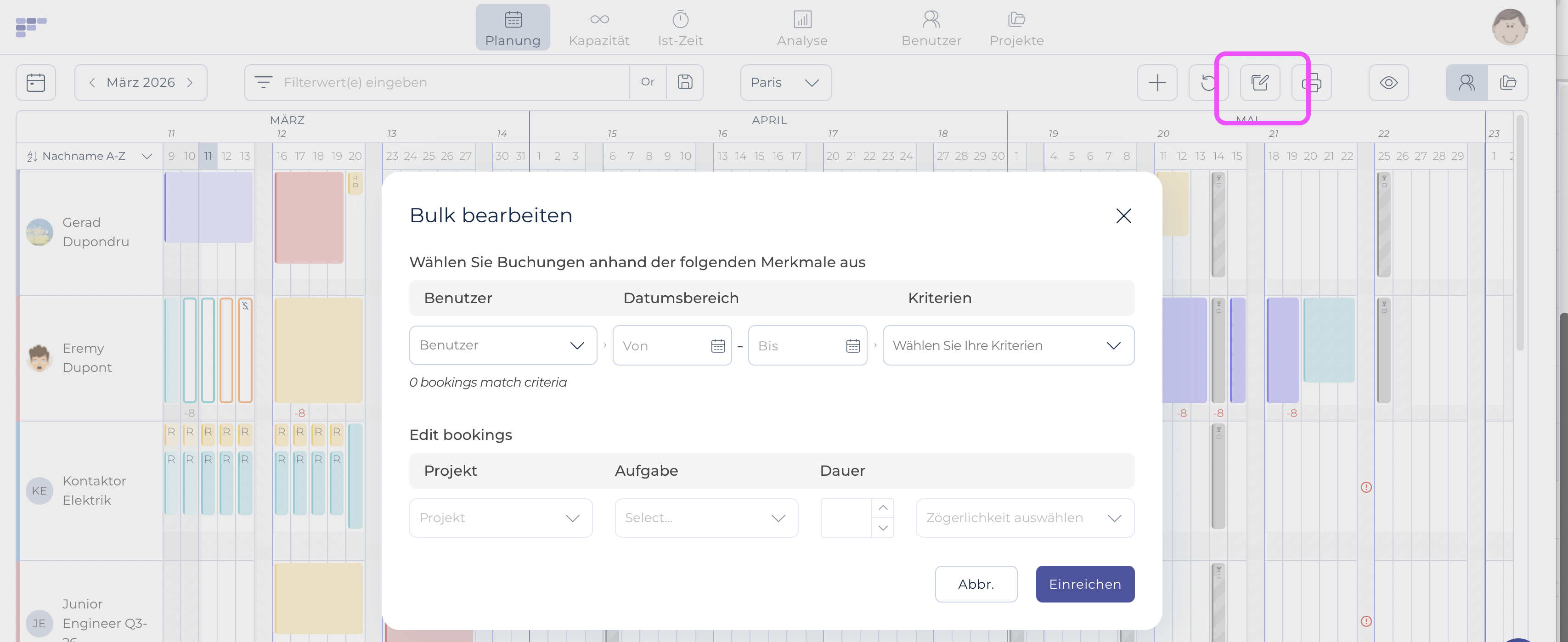 Mit der Schaltfläche Massenbearbeitung können Planer systematische Änderungen an bestehenden Buchungen vornehmen. So können Planer beispielsweise die zukünftige Projektzuweisung von Benutzer X von Projekt A zu Projekt B in Massenbearbeitung ändern. Außerdem können Planer den Status aller Buchungen für den nächsten Monat von „Vorläufig“ in „Genehmigt“ ändern.