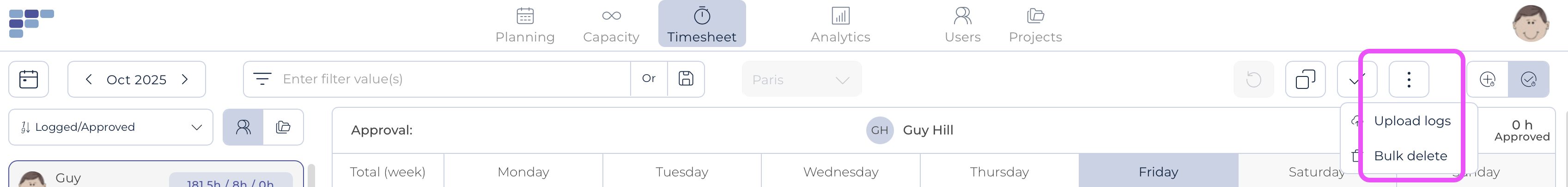 This feature can be found in the Timesheet module, on the Manage log screen, when clicking on the "3 dots" button. There you will also find a tool to bulk delete timesheet logs.
