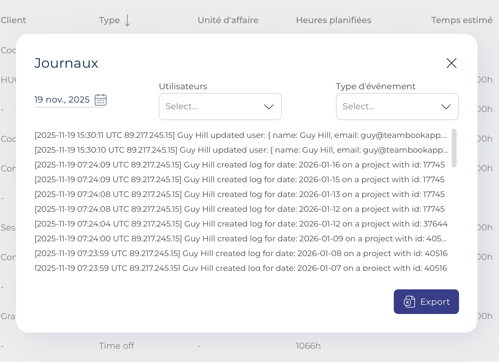 Le Journal d'Audit enregistre automatiquement toutes les actions importantes effectuées dans votre compte Teambook: créations, modifications et suppressions de données (utilisateurs, projets, enregistrements, etc.).