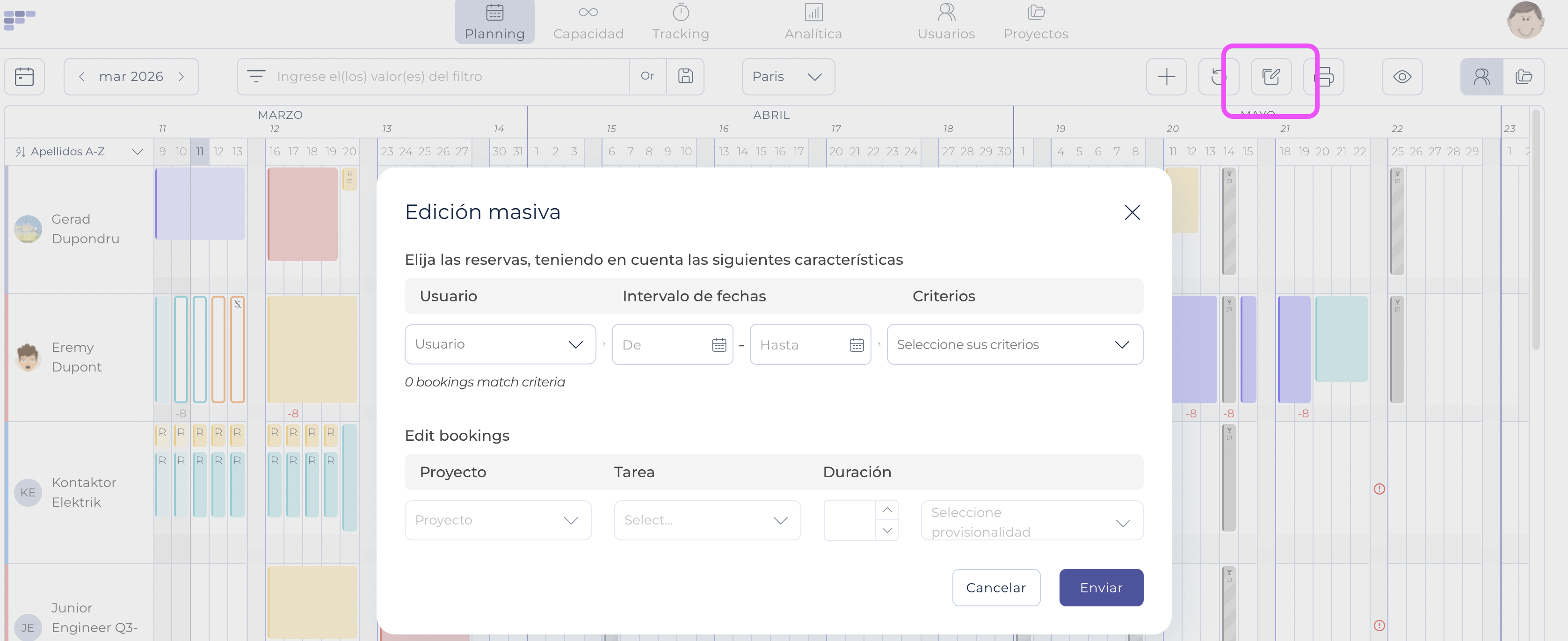 El botón Edición masiva permite a los planificadores realizar cambios sistemáticos en las reservas existentes. Por ejemplo, permite a los planificadores cambiar la asignación futura del usuario X del proyecto A al proyecto B de forma masiva. También permite a los planificadores cambiar el estado de todas las reservas del mes siguiente de Provisional a Aprobado.
