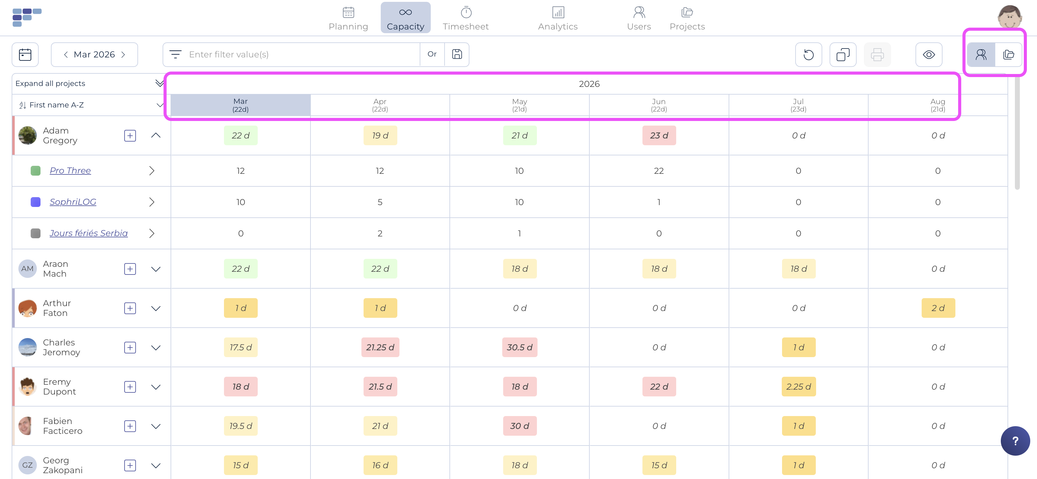 Un selector situado en la parte superior derecha le permite profundizar en su planificación de la capacidad por usuarios y por proyectos .