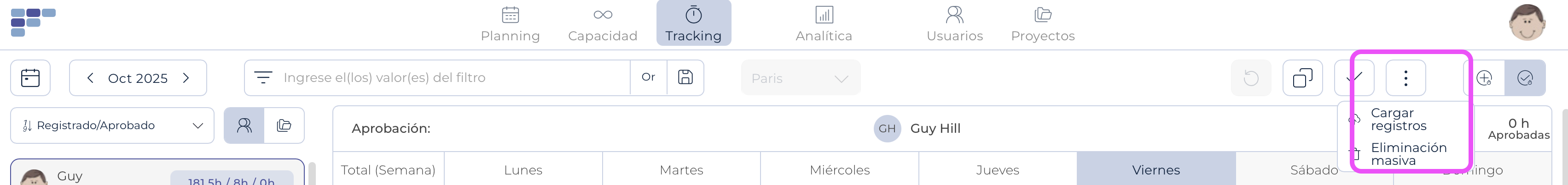 Esta función se encuentra en el módulo Tracking, en la pantalla Aprobar, al hacer clic en el botón «3 puntos». Allí también encontrará una herramienta para eliminar de forma masiva los registros de la hoja de horas.
