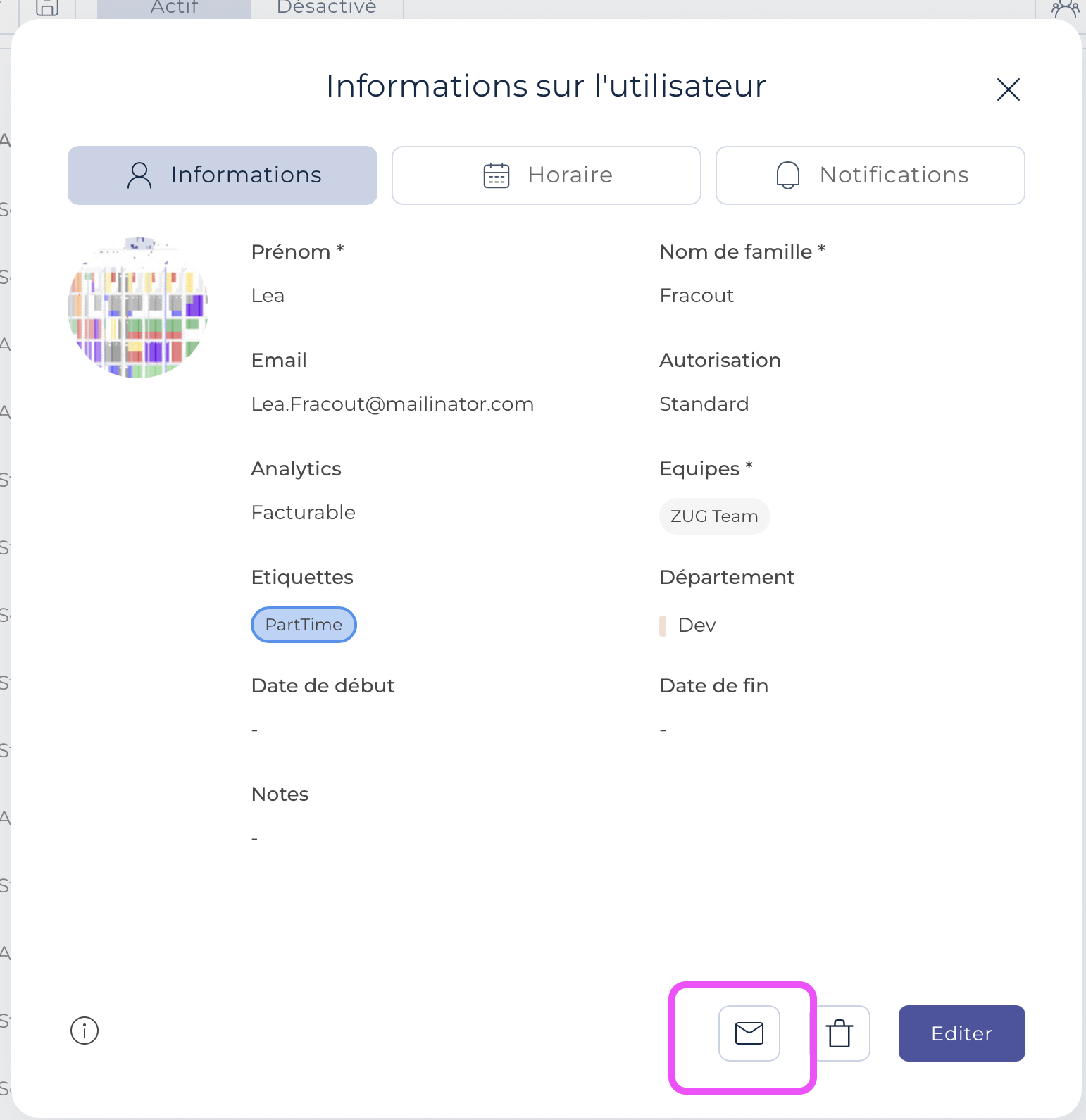Si, pour une raison quelconque, l'invitation doit être renvoyée, vous pouvez le faire en utilisant l'icône appropriée sur la page des données de base de l'utilisateu:
