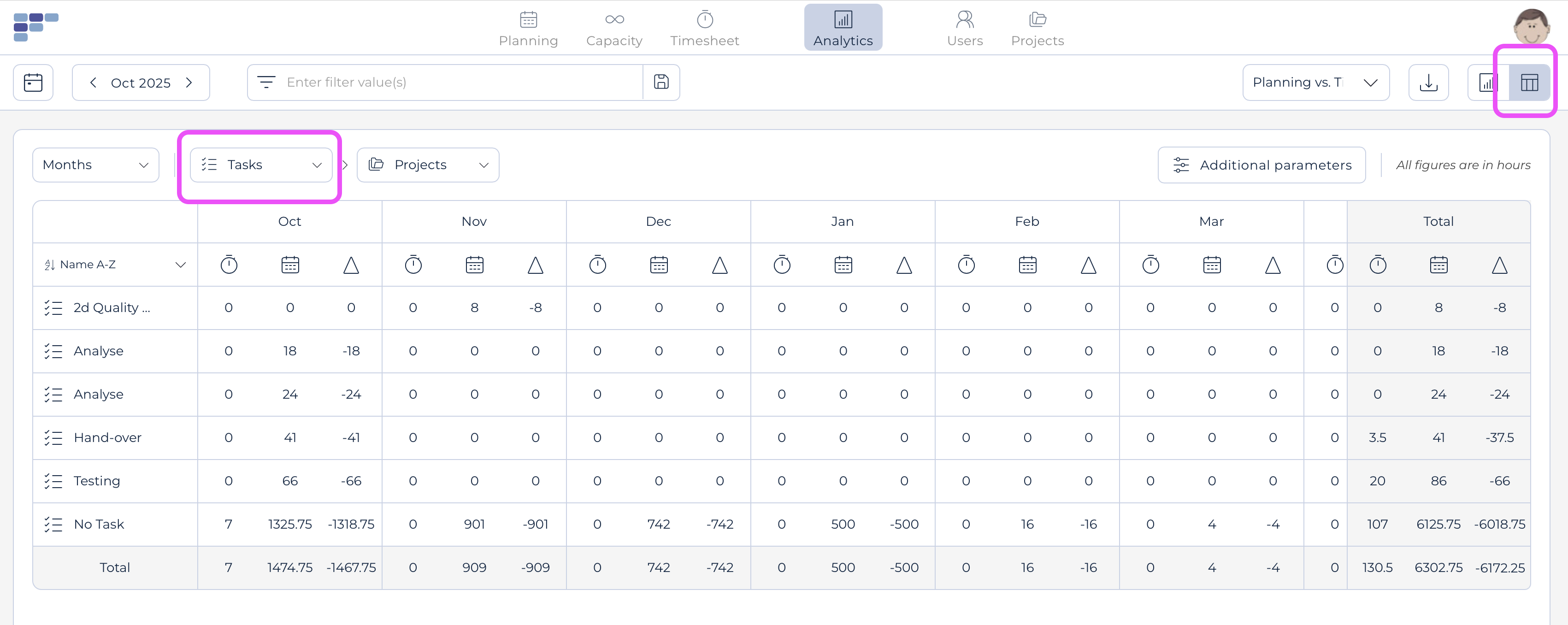 Dans la section Analyse, les rapports « Planification. Feuille de temps » et « Planification vs feuille de temps » vous permettent de passer à une vue des tâches :
