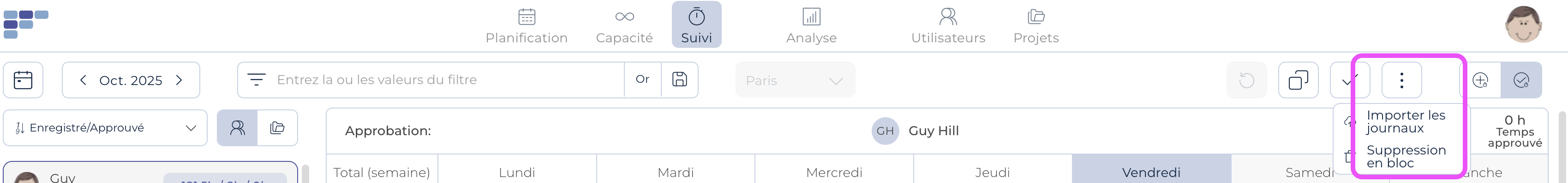 Cette fonctionnalité se trouve dans le module Suivi, sur l'écran Approuver, en cliquant sur le bouton « 3 points ». Vous y trouverez également un outil permettant de supprimer en masse les journaux de feuilles de temps.