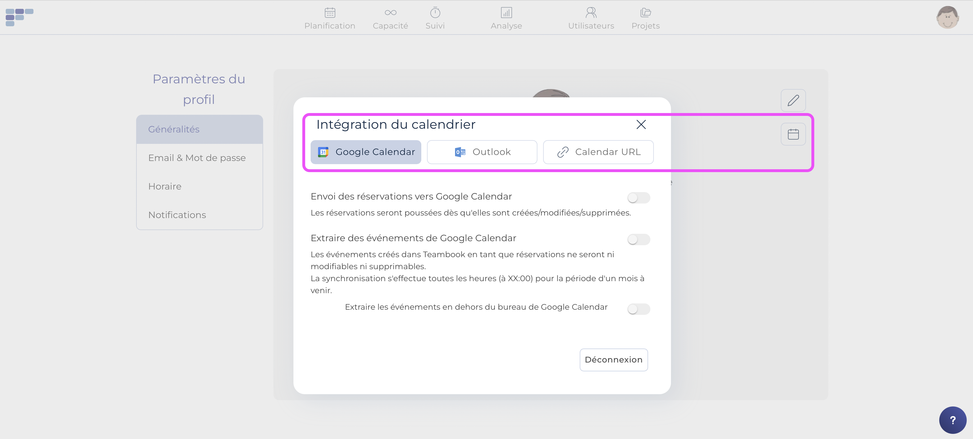 Grâce à l'intégration de Google Calendar, vous pouvez importer automatiquement les événements de votre calendrier dans Teambook (« Pull »), exporter les réservations de Teambook vers Google Calendar (« Push »), ou faire les deux, c'est-à-dire une synchronisation à deux voies (modes « Push » et « Pull »).