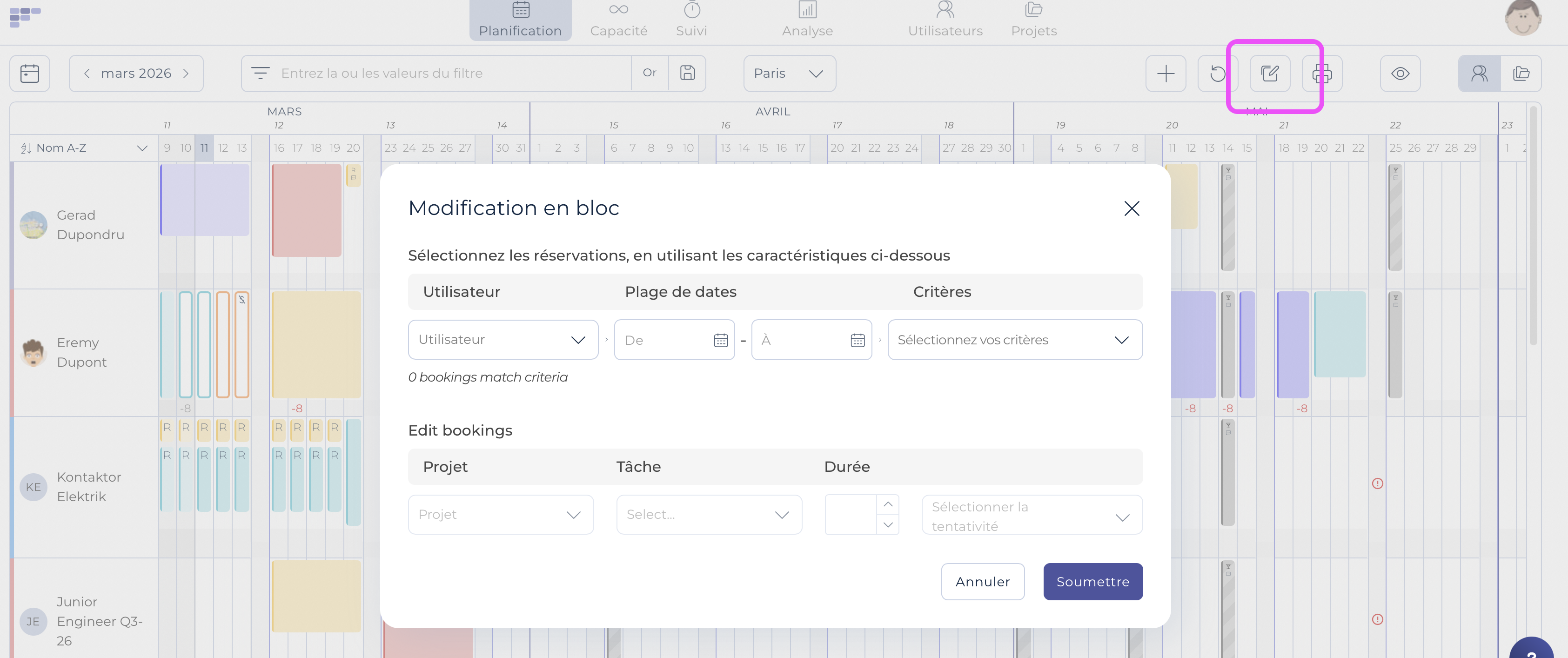 Le bouton Modification groupée (ou Modification en masse) permet aux planificateurs d'apporter des modifications systématiques aux réservations existantes. Par exemple, il permet aux planificateurs de modifier en bloc l'affectation future de l'utilisateur X du projet A au projet B. Il permet également aux planificateurs de modifier le statut de toutes les réservations du mois suivant de « Provisoire » à « Approuvé ».