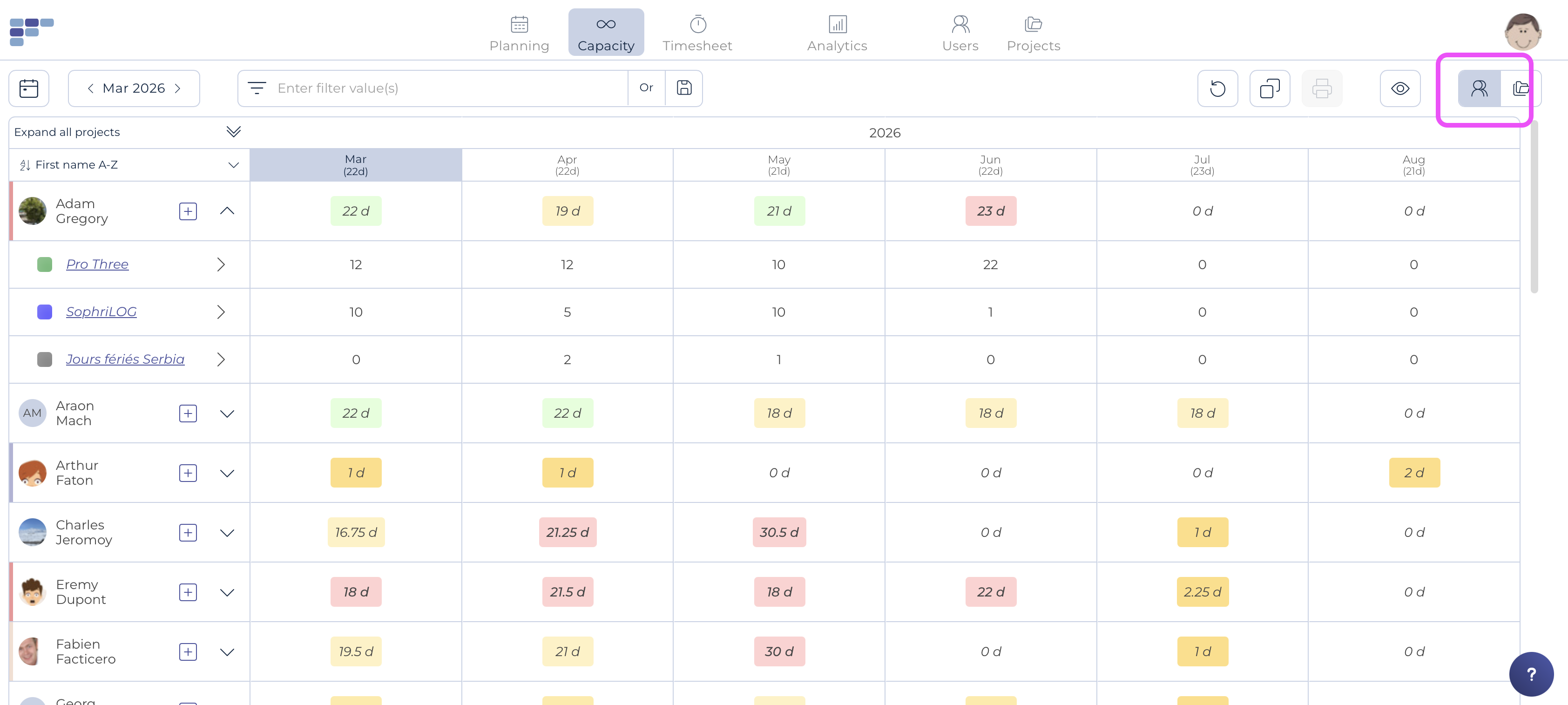 La ligne du total (en face du nom de l'utilisateur) est grisée car elle additionne les chiffres par projet. Le code couleur de cette ligne indique si le nombre de jours planifiés est supérieur (rouge), inférieur (jaune) ou égal au nombre de jours disponibles pour chaque utilisateur (sur la base de son emploi du temps réel). Notez que vous pouvez trier les colonnes pour identifier rapidement les utilisateurs présentant la plus forte sous-capacité ou surcapacité au cours d'un mois donné.