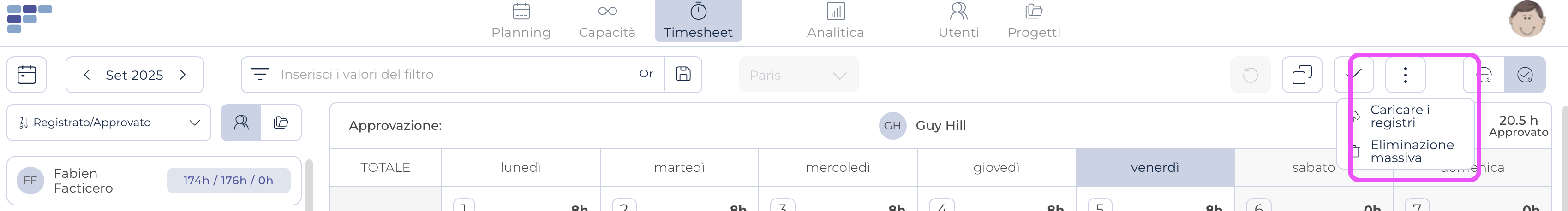 Questa funzione è disponibile nel modulo Timesheet, nella schermata Gestisci registri, cliccando sul pulsante con i “3 puntini”. Qui troverai anche uno strumento per eliminare in blocco i registri dei fogli presenze.