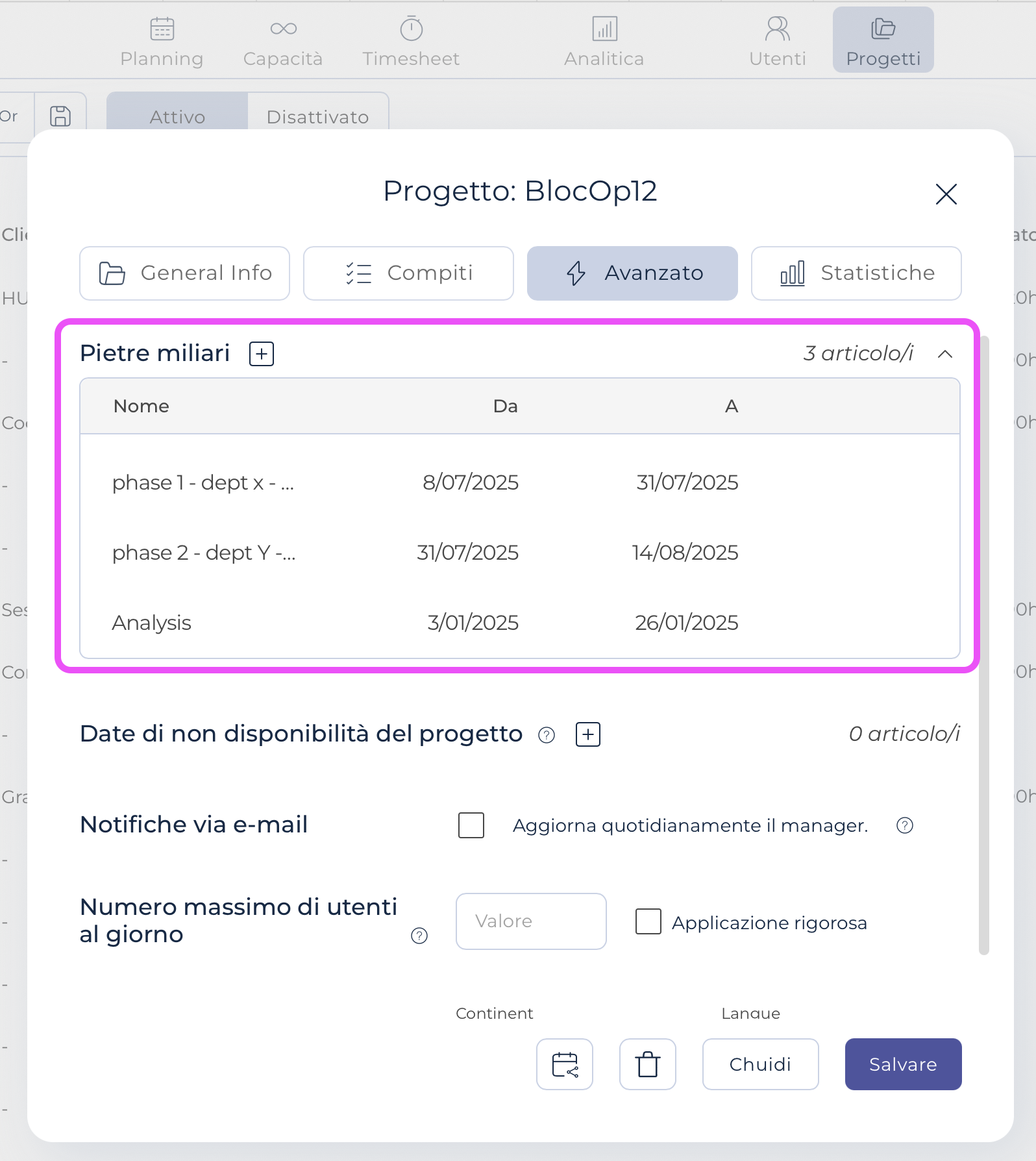Nel menu Progetto, selezionare il progetto desiderato; nella scheda Avanzate è possibile visualizzare, aggiungere e modificare le milestone: